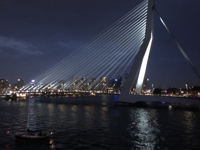 Nach dem gemütlichen Frühstück sind wir mit dem kostenlosen Shuttlebus in die Stadt gefahren und haben uns als erstes die super moderne Markthalle angeschaut. Von dort aus sind wir zum Stadhuis und dann auf ein Bier in die Witte de Withstraat. Anschließend sind wir mit dem Senioren Tagesticket für 4,50€ nach Delfshaven gefahren und haben uns einen alten Stadtteil angeschaut. Auf dem Rückweg sind wir noch in den alten Hafen, wo so einige kleine Frachtschiffe lagen, die über 100 Jahre alt waren. Zum Schiff mussten wir nur noch über die Erasmus Brücke. Den Abend waren wir an der Lanaibar.
